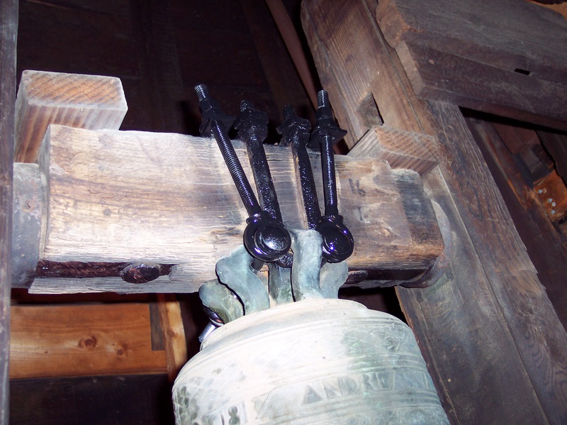 Remounted bell with new shackles and bolts to stabilize bell sufficiently to allow safe pealing and tolling, as well as ringing longevity, as seen in the above photo.
